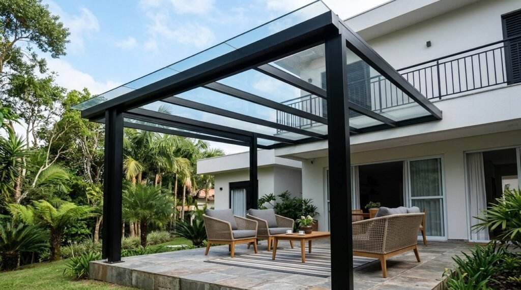 A cobertura retrátil permite ajuste conforme a necessidade, ideal para varandas, terraços e áreas gourmet.